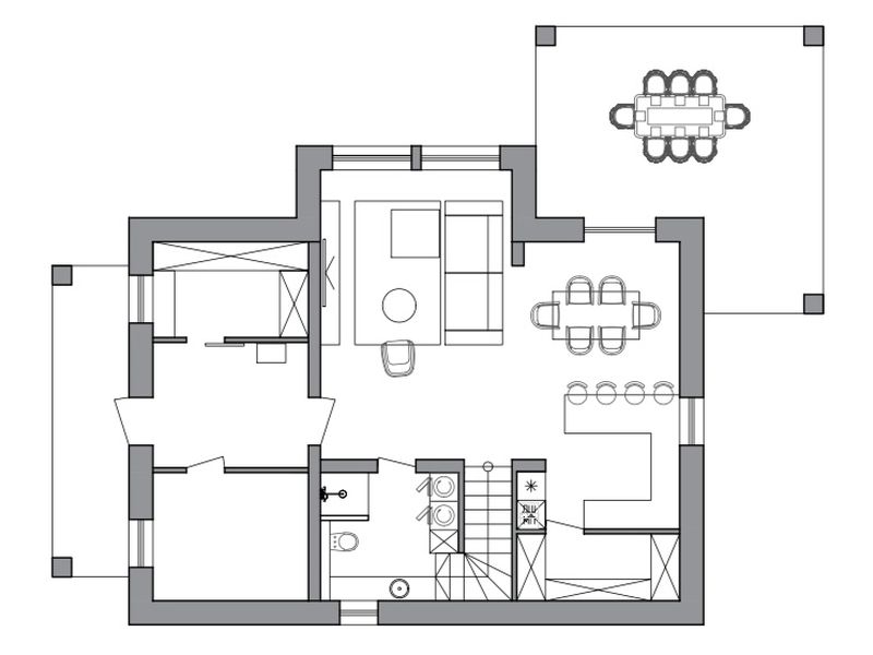 1 этаж: Кухня-гостиная 42 м² с выходом на просторную веранду 28 м² и панорамным видом на участок, кухонная кладовая 4 м², просторная прихожая 6 м², кабинет 9 м², санузел 7 м², просторная бойлерная 9 м².